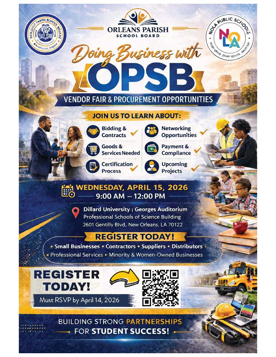 Get ready—our Procurement Vendor Fair is almost here! We’re excited to have you join us, in our FREE, symposium style information session! You'll hear directly from the Procurement Team and learn how to do business with the Orleans Parish School Board (NOLA‑PS). We want you there—no matter the size of your business! All business types are welcome, from professional and general services to legal, construction, catering, and more! Click here to register today and stay tuned for more details. It’s going to be an amazing experience; we can’t wait to see you there! YOU MUST REGISTER USING THE RSVP LINK ABOVE NO LATER THAN TUESDAY, APRIL 14 OR SCAN THE QR CODE TO THE LEFT!